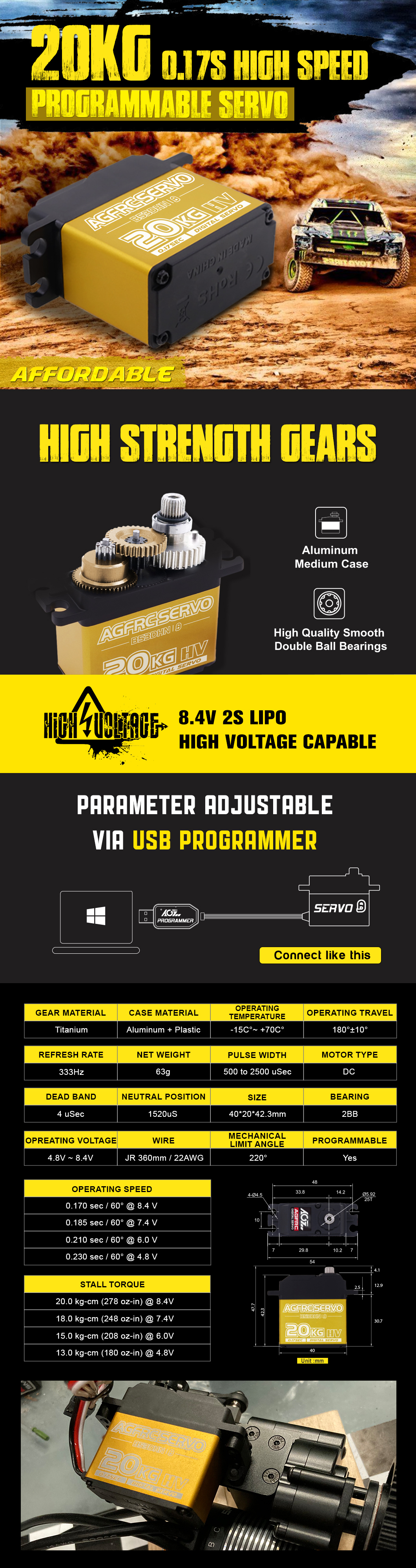 AGFRC B53DHN programmable digital DC servo inherited the newly yellow case design of B53DHS, , Dust and splash housing and super silky double bearings. Programmable digital circuits provide you with more fun choices. B53DHN is not only an Affordable price servo, but also meets the functional needs of most customers. This new product is sure to surprise you.