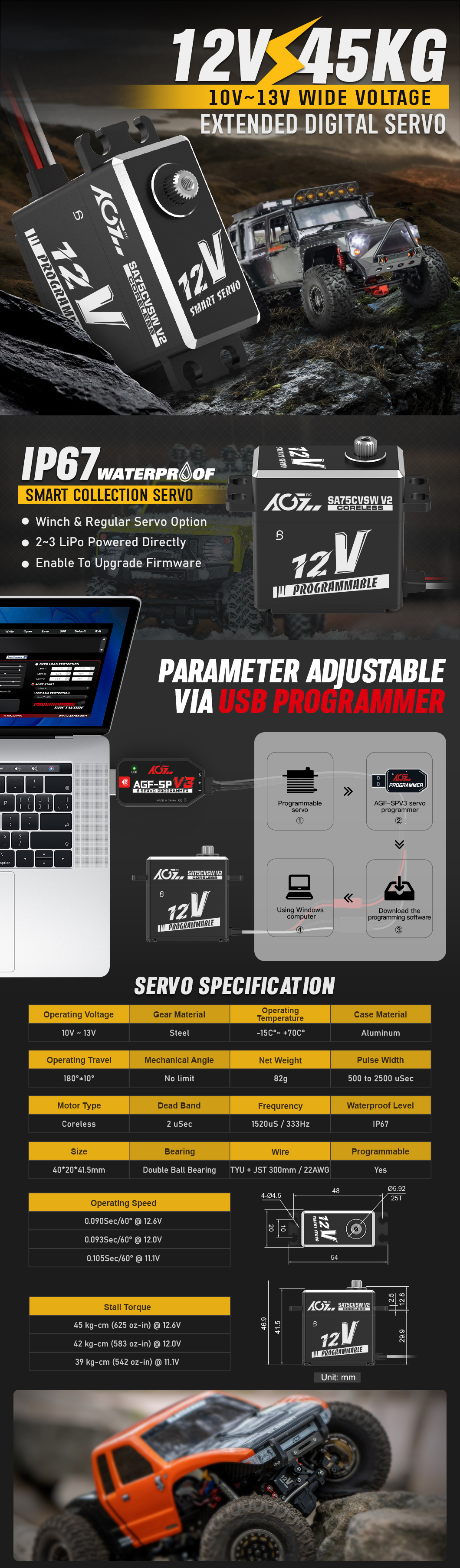 As 2s Lipo application cannot meet more and more people's usage, this 3s Lipo 12V Series Smart Servo is especially designed for higher voltage applications, such as R/C Crawler Cars, Airplanes, Boats, Robots, or Industrial/Medical applications. The highlight of this smart servo is available to upgrade the firmware via a USB programmer for different usage as required.