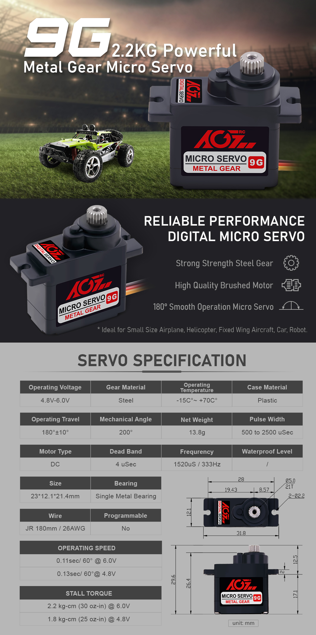 AGFRC B9DLM is a 9g digital high performance micro servo, high durable metal gears and 21T steel spline, which produce 2.2KG torque and 0.11Sec speed at 6V. It is allowed to work between -15℃ to 70℃ environment temperature. 180° maximum operation angle can meet most of requirements, perfect suit for most small size RC Aircraft, Car, Helicopter, Robot etc.