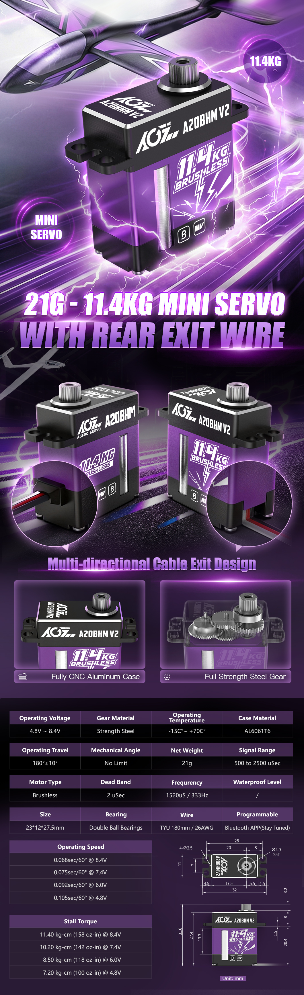 AGFRC A20BHM V2 11.4 kg·cm Torqye & 0.068 sec/60° Mini Servo with Multi-directional Cable Exit