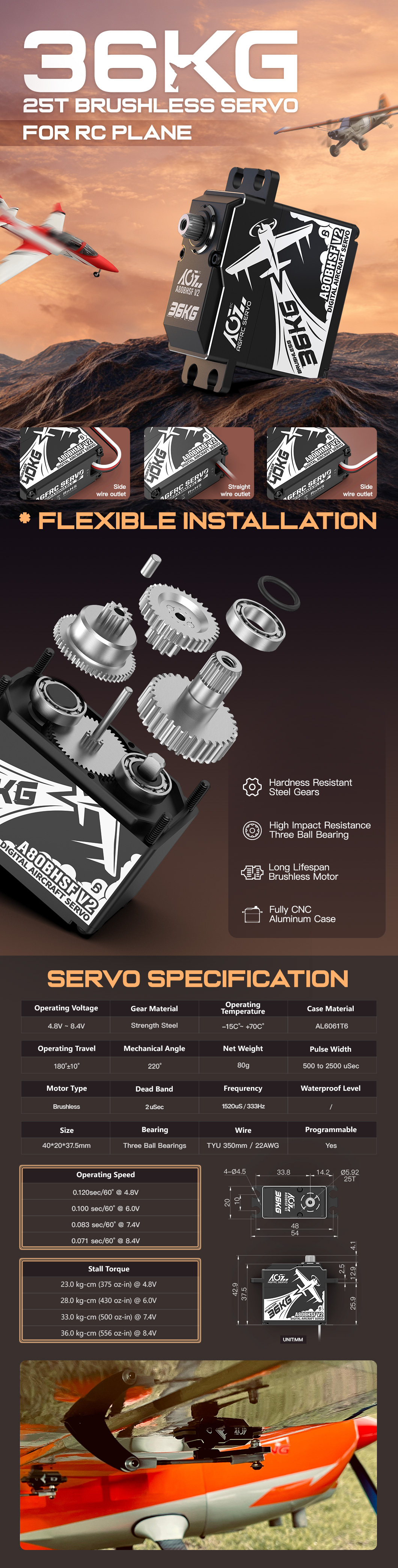 AGFRC A80BHSF V2 36kg Torque 0.071sec Programmable Digital 25T Brushless Standard Servo For Rc Aircraft
